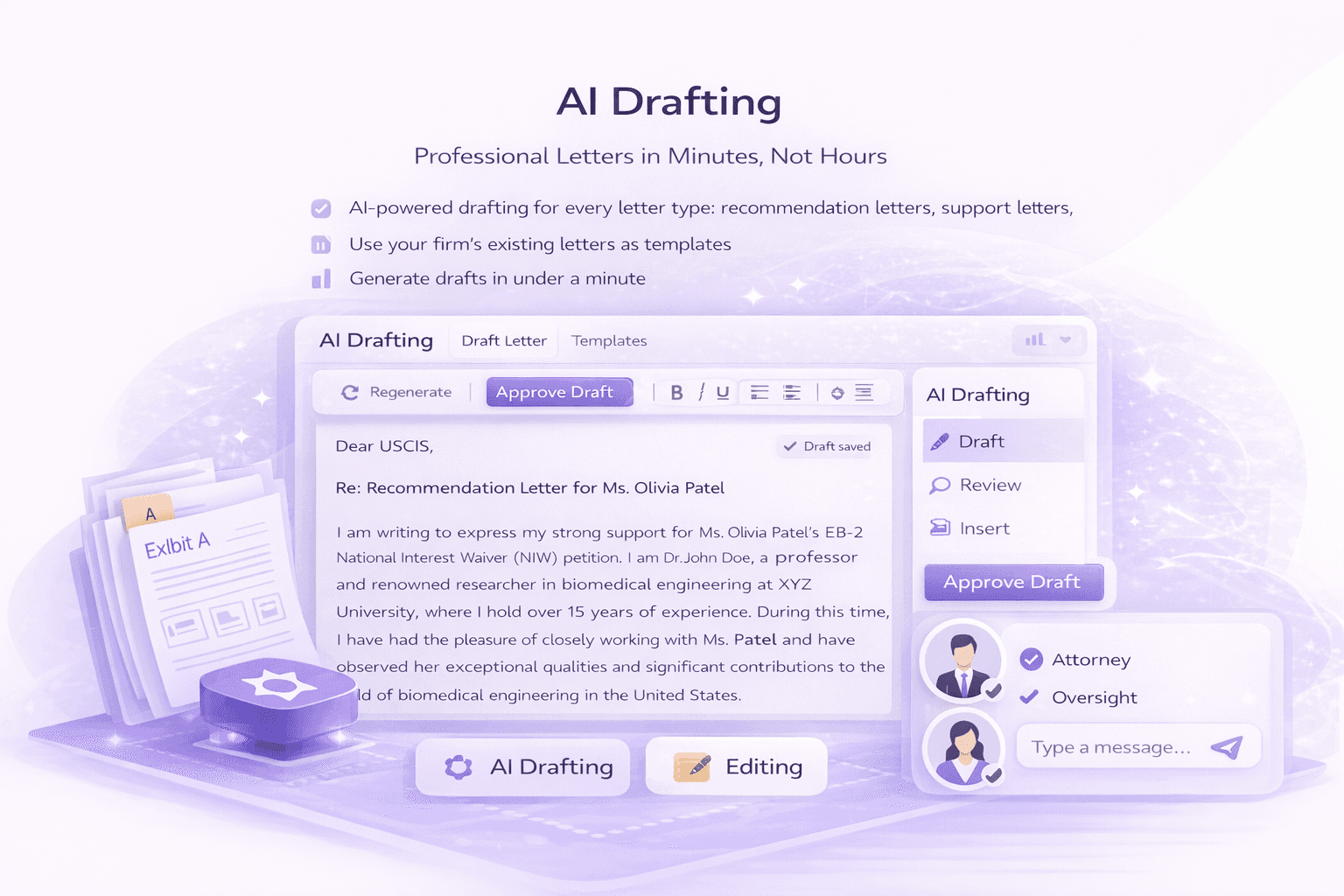Create polished letters and fully structured exhibit sets with guided AI and attorney oversight.
