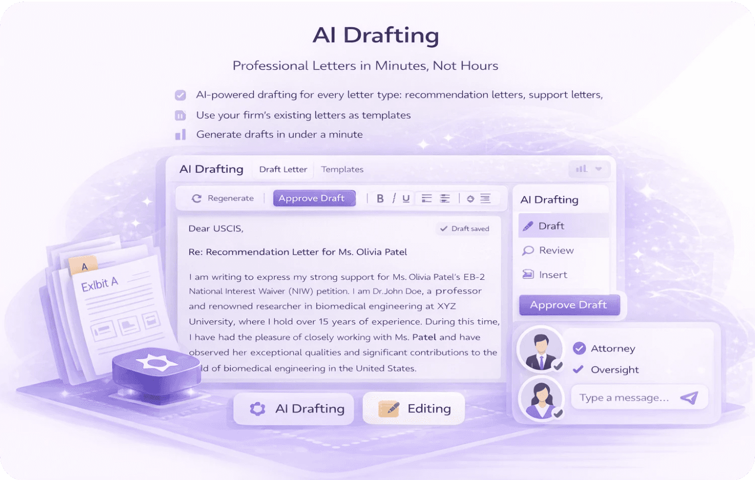 Everything you need to create immigration letters—from smart questionnaires and fast AI drafting to firm-styled templates and built-in editing tools.