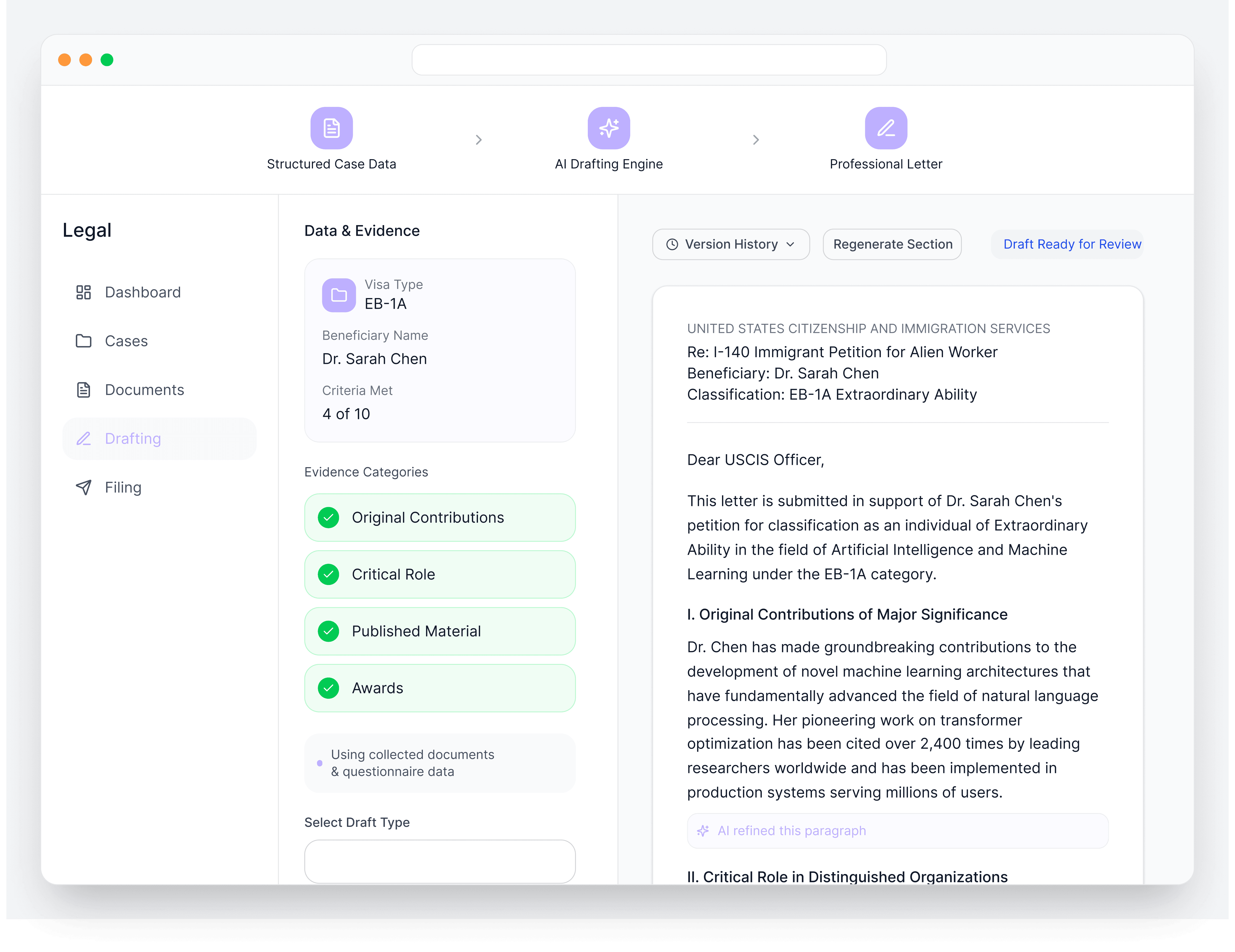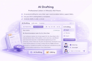 Drafting immigration letters is time-consuming. Each case needs multiple letters: recommendation letters from different people, support letters addressing specific criteria, cover letters summarizing the entire application. And when you get an RFE, you're starting from scratch under deadline pressure. While LegalBridge AI can draft high-quality letters in minutes.