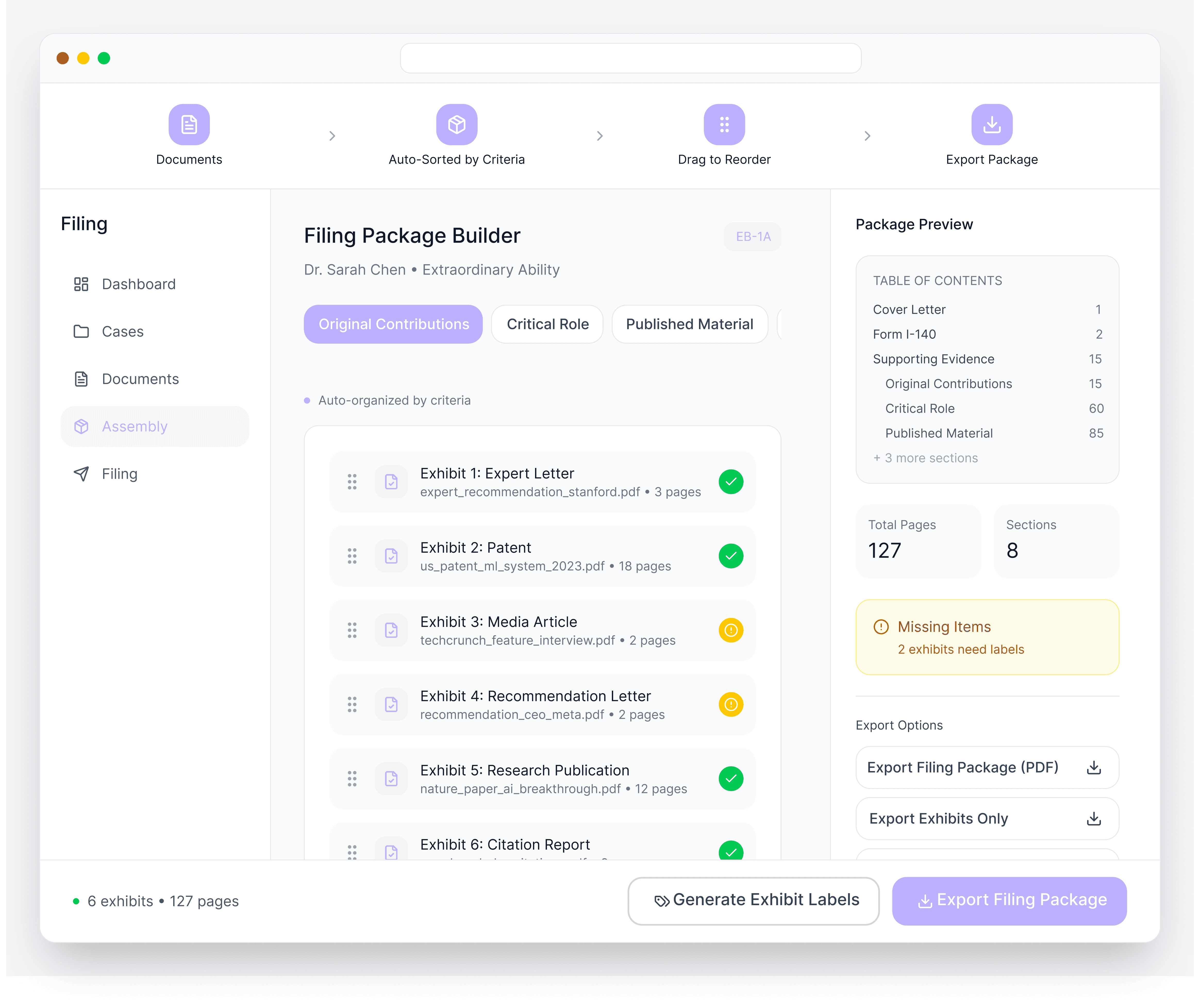 Auto-generate labeled exhibits organized by visa criteria, reorder with drag-and-drop, and assemble a complete filing package in one click.