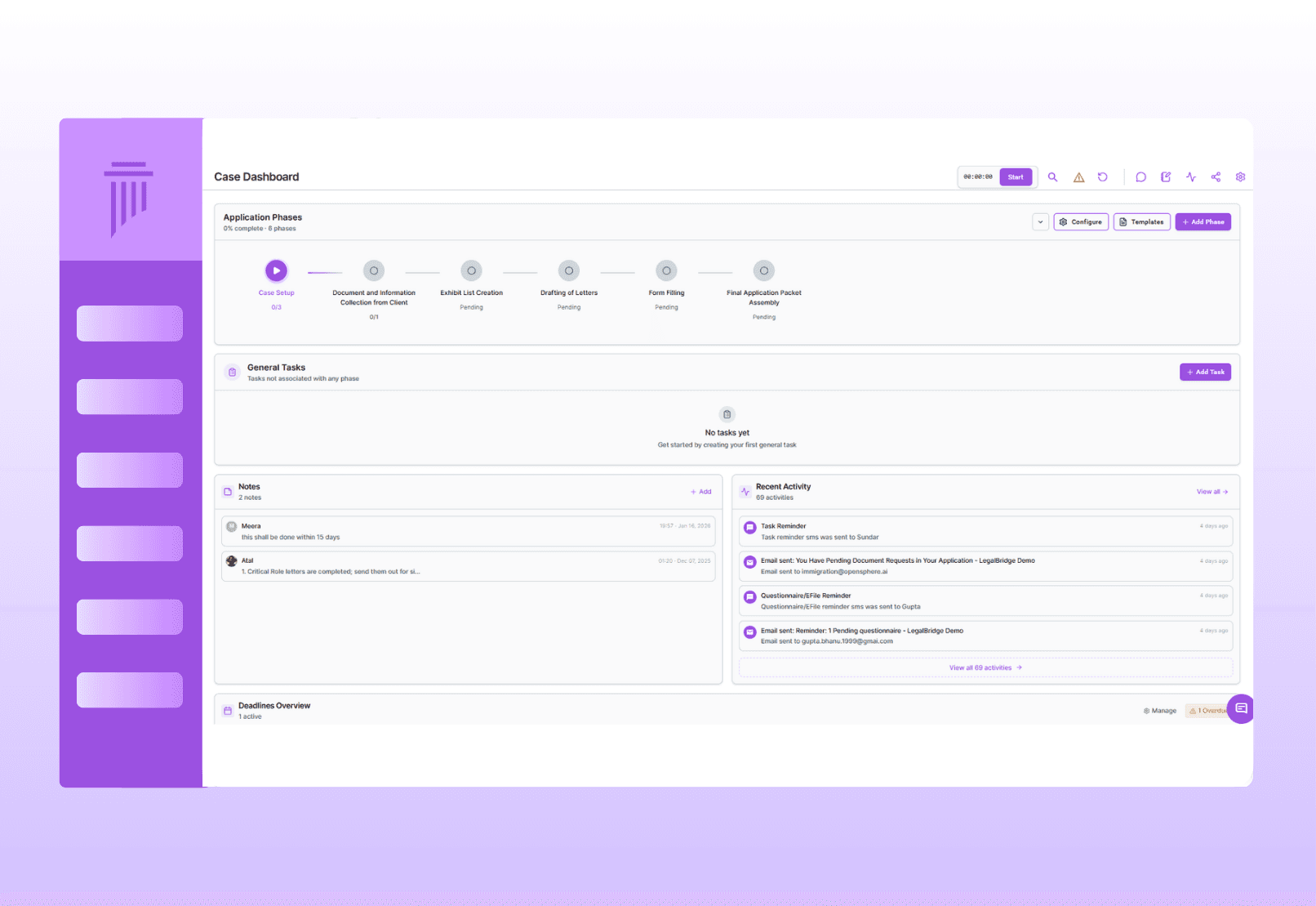 Immigration deadlines are unforgiving. A missed I-94 expiration can put a client out of status. A missed priority date window can delay a green card by months. And without clear visibility into your firm's caseload, you're flying blind on approvals, denials, and payments.LegalBridge tracks every deadline automatically and alerts you before anything slips.
